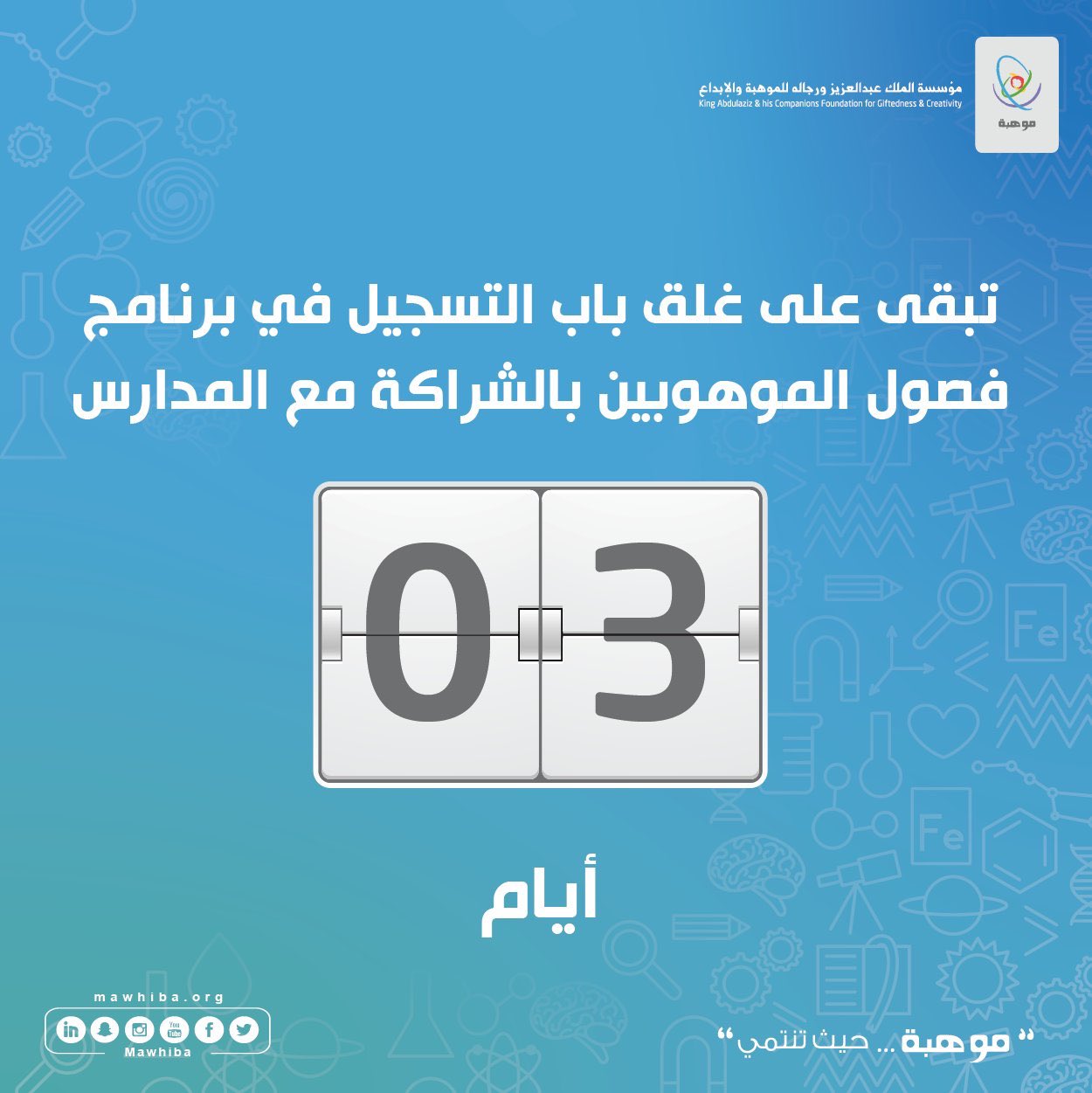 وكيف سيكون في مختلف المجالات وذلك على منصة المؤتمر العالمي للموهبة والإبداع الذي تنظمه مؤسسة الملك عبدالعزيز ورجاله للموهبة والإبداع موهبة والأمانة السعودية لمجموعة. تسعى مؤسسة الملك عبدالعزيز ورجالة للموهبة والإبداع موهبة إلى تقديم البرامج االإثرائية لهذا العام 2020م عن بعد وذلك حرصا من موهبة في استمرار تقديم برامج إثرائية للطلبة الموهوبين بما يحقق الأهداف المرجوة في رعاية.