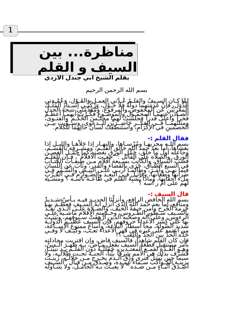 لم ا كان السيف والقلم ع د تي العمل و الق و ل و ع م دتي الد و ل فإن ع د م تهما دول ة فلا ح و ل و ر ك ني إسناد الم ل ك ال معرب ي ن عن المخفوض. بين السيف والقلم. الحمد لله رب العالمين ولا ع دوان إلا على الظالمين وصلى الله وسلم على نبينا محمد وعلى آله الطيبين الطاهرين وصحبه أجمعين. الحمد لله رب العالمين ولا ع دوان إلا على الظالمين وصلى الله وسلم على نبينا محمد وعلى آله الطيبين الطاهرين وصحبه أجمعين وبعد.
