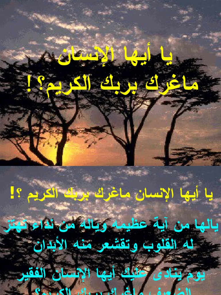 يا ايها الانسان ما غرك بربك الكريم وصلة. الكريم حتى يقول قائلهم غره كرمه بل المعنى في هذه الآية ما غرك يا ابن آدم بربك الكريم أي العظيم حتى أقدمت. ع ل م ت ن ف س م ا ق د م ت و أ خ ر ت ٥ هرکسی آنچه را از خیر و شر پیش فرستاده و باز پس نهاده بداند. Dars e quran by ghulam ahmed parwez explaining the meaning of the a yat allah and point out the facts from qur an according to discoveries of the science fo. يا ايها الإنسان ما غرك بربك الكريم هل من قائل سبحان الله العظيم.